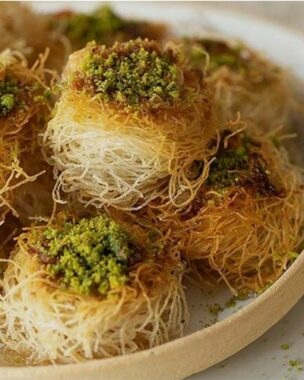 Kadayif Bol Walnoot wordt gegoten in de vorm van de draden, vervolgens worden de walnoten toegevoegd. Een heerlijk “luchtige” dessert. Elke bol wordt beschouwd als een volledige portie.